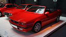 The Biturbo proper was a two-door 2+2 coupé, introduced in December 1981.[4] It was powered by a twin-turbo V6, producing 180 to 205 PS (132 to 151 kW; 178 to 202 bhp). The Biturbo name disappeared when the car was significantly redesigned in 1988. After 1994 the two-door car was again significantly reworked and became the Ghibli.