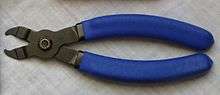 A master link or quick-release link is a roller chain accessory that allows convenient connection and disconnection of a chain without the need for a chain tool.[1] It acts as a set of the chain's outer plates, so joining two sets of the chain's inner plate ends. Such master links may or may not be re-usable.[2] A chain tool is nonetheless needed to adjust a chain's length, for example to shorten a new chain before connecting its ends. They are used on bicycles and motorcycles.[3]