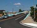 The swing bridge was replaced by the current bridge in 1979.[3] The current bridge is a 65 foot tall fixed span to accommodate the area's large shrimping vessels without disrupting traffic. The current bridge was built one block east of the swing bridge to accommodate its height, and the old bridge's approach is now known as Old San Carlos Boulevard on the island side.