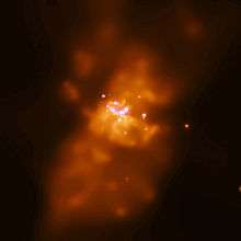 The Chandra X-ray Observatory detected fluctuating X-ray emissions from a location approximately 600 light-years away from the center of M82. Astronomers have postulated that this fluctuating emission comes from the first known intermediate-mass black hole, of roughly 200 to 5000 solar masses.[15] M82, like most galaxies, hosts a supermassive black hole at its center with a mass of approximately 3 x 107 solar masses as measured from stellar dynamics.[16]