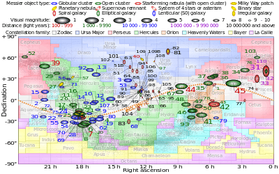 Plot of declination vs right ascension of the Messier objects relative to the modern constellations, ecliptic and Milky Way