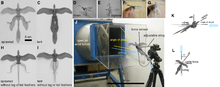 It was originally thought that Microraptor was a glider, and probably lived mainly in trees, because the hindwings anchored to the feet of Microraptor would have hindered their ability to run on the ground.[10] Some paleontologists have suggested that feathered dinosaurs used their wings to parachute from trees, possibly to attack or ambush prey on the ground, as a precursor to gliding or true flight.[5] In their 2007 study, Chatterjee and Templin tested this hypothesis as well, and found that the combined wing surface of Microraptor was too narrow to successfully parachute to the ground without injury from any significant height. However, the authors did leave open the possibility that Microraptor could have parachuted short distances, as between closely spaced tree branches.[3][5] Wind tunnel experiments have demonstrated that sustaining a high-lift coefficient at the expense of high drag was likely the most efficient strategy for Microraptor when gliding between low elevations. Microraptor did not require a sophisticated, ‘modern’ wing morphology to be an effective glider.[11] However, the idea that Microraptor was an arboreal glider relies on it to have regularly climbed or even lived in trees, when study of its anatomy have shown that its limb proportions fall in line with modern ground birds rather than climbers, and its skeleton shows none of the expected adaptations in animals specialized for climbing trees.[12]
