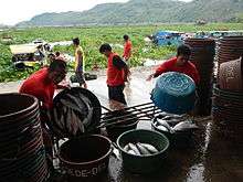 Fry are raised in either sea cages, large saline ponds (Philippines), or concrete tanks (Indonesia, Taiwan).[5] Milkfish reach sexual maturity at 1.5 kg (3.3 lb), which takes five years in floating sea cages, but eight to 10 years in ponds and tanks. Once they reach 6 kg (13 lb), (eight years), 3–4 million eggs are produced each breeding cycle.[5] This is mainly done using natural environmental cues. However, attempts have been made using gonadotropin-releasing hormone analogue (GnRH-A) to induce spawning.[8] Some still use the traditional wild stock method — capturing wild fry using nets.[5] Milkfish hatcheries, like most hatcheries, contain a variety of cultures, for example rotifers, green algae, and brine shrimp, as well as the target species.[5][9] They can either be intensive or semi-intensive.[5] Semi-intensive methods are more profitable at US$6.67 per thousand fry in 1998, compared with $27.40 for intensive methods.[9] However, the experience required by labour for semi-intensive hatcheries is higher than intensive.[9] Milkfish nurseries in Taiwan are highly commercial and have densities of about 2000/L.[5] Indonesia achieves similar densities, but has more backyard-type nurseries.[5] The Philippines has integrated nurseries with grow-out facilities and densities of about 1000/L.[5] The three methods of outgrowing are pond culture, pen culture, and cage culture.