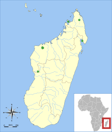 Miniopterus brachytragos is known from several ecologically different sites. In the Namoroka region, it has been recorded at 100 to 200 m (330 to 660 ft) altitude in dry forest and gallery forest. Another specimen was caught in forest in a karst region in Bemaraha. Near Daraina in the northeast, the species occurs in eastern humid forest mixed with dry forest at 320 m (1,050 ft). At another northeastern site, on the Masoala Peninsula, it was found in lowland gallery forest near sea level. On Nosy Komba, its habitat consists of dry forest mixed with introduced Mangifera indica (mango tree).[16] Little is known of the ecology of M. brachytragos, but species of Miniopterus generally feed on insects, breed seasonally, and roost in large colonies in caves.[17]