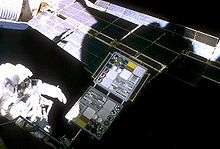 The Mir Environmental Effects Payload (MEEP) was a set of four experiments installed on the Russian space station Mir from 1996 to 1997 to study the effects of space debris impacts and exposure to the space environment on a variety of materials.[1] The materials used in the experiments were being considered for use on the International Space Station, and by exposing them at a similar orbital altitude to that flown by the ISS, the experiments provided an assessment of the performance of those materials in a similar space environment.[1] MEEP also fulfilled the need to examine the occurrence and effects of man-made debris and natural micrometeoroids through capture and impact studies.[1] The experiments were installed on the Mir docking module during STS-76,[2] and retrieved during STS-86.[3]