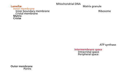 A mitochondrion contains outer and inner membranes composed of phospholipid bilayers and proteins.[14] The two membranes have different properties. Because of this double-membraned organization, there are five distinct parts to a mitochondrion. They are:
