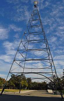 In 1977, a nearly half-sized replica (shown in a photo on the right) was constructed at the San Jose Historical Museum,[20] also known as History San José, at 1650 Senter Road. It is 115 feet (35 m) tall.[21] It is approximately 3.2 miles (5.1 km) from the original location, about an eight-minute drive away.[22] [23] [24]