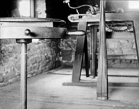 The scotch turbines produced (for example, on Plane 2 West) 235 horsepower using a 45-foot head of water and had a discharge rate of 1,000 cubic feet per minute. The winding drum was 12 feet in diameter, and had a spiral grove of 3 inch pitch. The rope was fastened on both ends to the drum, and there was a clutch which allowed reversing the direction of the wheel. The plane had 2 lines of steel rails, with a "gauge" of 12 foot 4½ inches from center of rail to center. Rails were 3⅛ inches wide at top, 3½ inches high, and weighed 76 lbs/yard. Also, the cradles had a brake, if things went downhill too fast, as well as the plane-man who would put about ½ the amount of full power through the turbine, so that the boat would not go down too fast.[15] The water was fed into the turbines from below, thus relieving friction on the bearings and balancing them. Some turbines were also reported to develop 704 horsepower.[16]