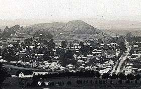 Detail from a postcard of Onehunga viewed from the west around 1910, showing Rarotonga / Mount Smart scoria cone before it was quarried away.