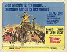 Mister Moses is a 1965 adventure film about a con man blackmailed into persuading an entire African village into relocating for their own safety. It stars Robert Mitchum and Carroll Baker. It was based on the novel of the same name by Max Catto. It was filmed on location in Kenya at Lake Naivasha and the Amboseli National Park.[2]