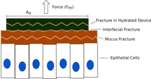 Bioadhesion is the mechanism by which two biological materials are held together by interfacial forces. When relating this mechanism to the pharmaceutical sciences, mucoadhesion describes the attractive forces between a biological material and mucus or mucous membrane.[1] Mucus membranes adhere to epithelial surfaces such as the gastrointestinal tract (GI-tract), the vagina, the lung, the eye, etc. They are generally hydrophilic as they contain many hydrogen macromolecules due to the large amount of water (approximately 95%) within its composition. However, mucin also contains glycoproteins that enable the formation of a gel-like substance.[1] Understanding the hydrophilic bonding and adhesion mechanisms of mucus to biological material is of utmost importance in order to produce the most efficient applications. For example, in drug delivery systems, the mucus layer must be penetrated in order to effectively transport micro- or nanosized drug particles into the body.[2]