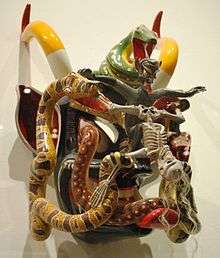 The museum is best known for its yearly parade of “monumental alebrijes” which began as a yearly event in 2007.[3] An alebrije is a fantastical creature, which usually include various parts of real-life or fantastic creatures. These not only include creatures such as flies with dragon tails and multi-headed lions, the works also carry fantastic names such as “La Mula de Seis” (The Six Mule), “Alebrijos” (combination of alebrije and “hijos” (sons)), “AH1N1” and “La Gárgola de la Atlántida” (The Gargoyle of Atlantis).[7] Normal alebrijes are small sculptures made of cardboard or wood, painted in bright colors and mostly made in central Mexico and Oaxaca state. Monumental alebrejes are floats with the tallest one so far being four meters tall by three meters wide.[3]