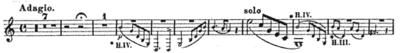 The cued instrument is indicated with text and the cue notes are smaller than the rest. The stems of cue notes all go in the same direction and cue notes are transposed into the key of the part entering.[1]