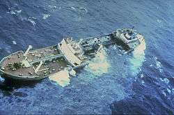 The Argo Merchant ran aground on December 15, 1976. A silvery oil slick can be seen coming from the center holds in the foreground.