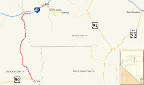 A route approximating the alignment of Eureka–Carlin Road appeared on state highway maps as a narrow, unimproved roadway as early as 1927.[6] By 1929, this road had been designated as State Route 20, and was shown to parallel the Eureka and Palisade Railroad connecting Eureka to State Route 1/US 40 (today's I-80) further west of Carlin via Palisade.[7] SR 20 was mostly upgraded to a gravel road by 1946[8] Except for the portion between Palisade and US 40, the road was completely paved by 1956—a road connecting just south of Palisade directly to Carlin (approximating today's alignment of the northernmost reaches of SR 278) was also paved by this time.[9] The Eureka–Carlin road portion of SR 20 was renumbered as part of State Route 51 by 1965.[10]
