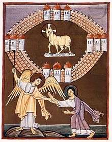 John of Patmos watches the descent of New Jerusalem from God in a 14th century tapestry. | |