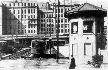 The terminal, opened on April 30, 1916 was located at the northeast corner of Park Place and Raymond Boulevard at Military Park, a few blocks away from the busy downtown crossing at Broad and Market Streets. It provided an off-street terminal for streetcars, and a central location for riders. The street entrance was between the two track levels, and provided access to the office floors and to both terminals. Most cars used the upper level, reached by a ramp from Mulberry Street on the east side. Some used the lower level, reached on the west side from Washington Street by a two-block Cedar Street Subway. In 1916 the upper level saw 2,050 cars a day and the lower 550 cars, with more than 50,000 fares paid per day. In 1935 the lower level was connected to the newly built City Subway, which ran under Raymond Boulevard adjacent to the terminal, to allow cars to continue to the subway terminal at Penn Station. The eastbound connection passed under the City Subway to avoid a grade crossing.