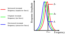 Amplitude modulation was one of the original modes of operation introduced by Binnig and Quate in their seminal 1986 AFM paper,[4] in this mode the sensor is excited just off resonance. By exciting the sensor just above its resonant frequency, it is possible to detect forces which change the resonant frequency by monitoring the amplitude of oscillation. An attractive force on the probe causes a decrease in the sensors resonant frequency, thus the driving frequency is further from resonance and the amplitude decreases, the opposite is true for a repulsive force. The microscopes control electronics can then use amplitude as the SPM reference channel, either in feedback mode, or it can be recorded directly in constant height mode.