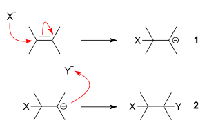 The driving force for the addition to alkenes is the formation of a nucleophile X− that forms a covalent bond with an electron-poor unsaturated system -C=C- (step 1). The negative charge on X is transferred to the carbon – carbon bond.[1]