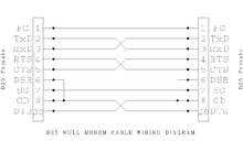 Below is a very common wiring diagram for a null modem cable to interconnect two DTEs (e.g. two PCs) providing full handshaking, which works with software relying on proper assertion of the Data Carrier Detect (CD) signal:[2]