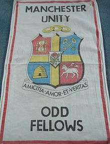 - ↑ There are, and have been, a number of different Orders of Oddfellows in the UK – refer to Societies using the name "Oddfellows" for a list. One of them, The Independent Order of Oddfellows Manchester Unity Friendly Society Limited, uses the trading name "The Oddfellows".[10] Thus, there can be ambiguity when referring to "the Oddfellows".</ref> <ref name='Manchester Unity website' group='lower-alpha'>Editors notes: The majority of the original content of this page was sourced from a document on the Manchester Unity website that does not quote its sources (Beresford 2006). That document's URL is no longer available although it can be accessed on the web via the Wayback Machine archive. Also most of its contents has now been distributed across a number of web pages, including: History of the Oddfellows 2012 and The Oddfellows Over the Years 2012. Other references tell a similar story, but they, too, rarely quote their sources.