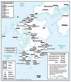 Operation Downfall was the codename for the Allied plan for the invasion of Japan near the end of World War II. The proposed operation was abandoned when Japan surrendered following the atomic bombings of Hiroshima and Nagasaki and the Soviet declaration of war.[13] The operation had two parts: Operations Olympic and Coronet. Set to begin in November 1945, Operation Olympic was intended to capture the southern third of the southernmost main Japanese island, Kyūshū, with the recently captured island of Okinawa to be used as a staging area. Later, in the spring of 1946, Operation Coronet was the planned invasion of the Kantō Plain, near Tokyo, on the Japanese island of Honshu. Airbases on Kyūshū captured in Operation Olympic would allow land-based air support for Operation Coronet. If Downfall had taken place, it would have been the largest amphibious operation in history.[14]
