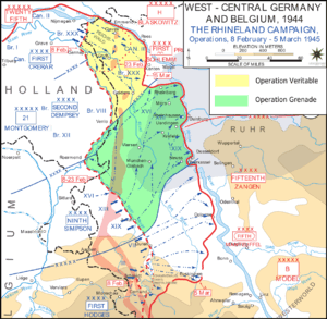 The 15th Division had orders to capture Kleve, but on the night of 9 February they were held up on the outskirts. The 47 Panzer Corps under General Heinrich Freiherr von Lüttwitz was directed to Kleve and the Reichswald. On 11 February the 15th had cleared the town. Having expanded the front line to 14 miles, the 2nd Canadian Corps, with the 2nd and 3rd Divisions and the 4th Armoured Division, became responsible for the drive along the Rhine to Kalkar and Xanten. XXX Corps were to operate on the right and take Goch before swinging towards the Rhine and linking with the Americans – once Operation Grenade had been launched.[12]