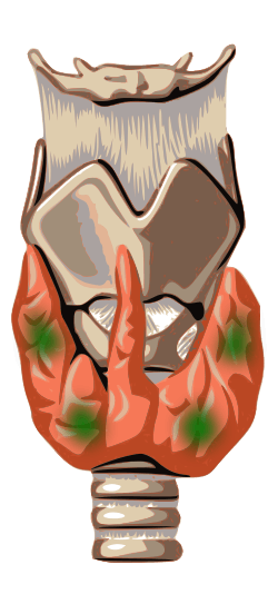 Diagram showing structures in the human neck. The four green shaded areas represent the most common position of the parathyroid glands, which are generally four in number and situated behind the lateral lobes of the thyroid gland (shaded orange). | |