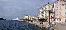 After 1918, it returned to the Kingdom of Italy. After WW II, in 1947, it was occupied by Jugoslavia and the city name was changed into Poreč. The Italian population left the city and was replaced by Slavic people from different regions of Yugoslavia.[4] In 1944, the city was bombed by the Allies 34 times, damaging 75% of the city.[5]