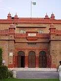 The British laid out the vast Peshawar Cantonment to the west of the city in 1868, and made the city its frontier headquarters.[16] Additionally, several projects were initiated in Peshawar, including linkage of the city by railway to the rest of British India and renovation of the Mohabbat Khan mosque that had been desecrated by the Sikhs.[20] The British also constructed Cunningham clock tower, in celebration of the Golden Jubilee of Queen Victoria, and, in 1906, constructed Victoria Hall (now home of the Peshawar Museum) in memory of Queen Victoria.[20] The British greatly contributed to the establishment of Western-style education in Peshawar with the establishment of Edwardes College and Islamia College in 1901 and 1913, respectively—these were established in addition to numerous other schools, many of which are run by the Anglican Church.[20] For better administration of the region, Peshawar and the adjoining districts were separated from the Punjab Province in 1901.[27]