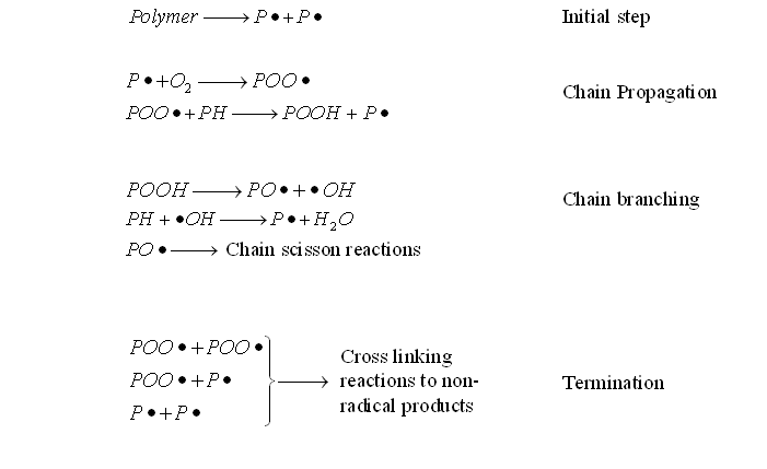 The photo-oxidation reactions include chain scission, cross linking and secondary oxidative reactions. The following process steps can be considered:[6]