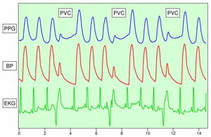 The height of AC component of the photoplethysmogram is proportional to the pulse pressure, the difference between the systolic and diastolic pressure in the arteries. As seen in the figure showing premature ventricular contractions (PVCs), the PPG pulse for the cardiac cycle with the PVC results in lower amplitude blood pressure and a PPG. Ventricular tachycardia and ventricular fibrillation can also be detected.