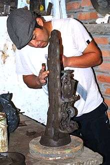 Metepec is one of a number of ceramic centers in Mexico, along with Oaxaca, Puebla, various parts of Michoacán and the Guadalajara area although it produces a significantly smaller quantity.[1] While other handcrafts are made in the municipality, pottery is the most important.[2] The creation of pottery in Metepec is traditional, family-oriented and of a distinctive local design and manufacture. It maintains many of its traditional techniques from the colonial period, passed down in pottery making families usually done by men but women are also involved. In many areas such as the neighborhood of Cuaxustenco, family homes double as workshops able to handle all phases of creation including firing. The pottery can be distinguished by both the clays it uses as well as its shapes and decorative styles, which unique to the area although not absolutely purist.[3] The clay used in Metepec pottery is extracted from neighboring areas such as Octotitlán, San Felipe Tlamimilolpan and Tlacotepec. This originally was down with cart and donkey but today is done with motorized vehicles.[4] There are three main clays, red, a sandy yellow and black.[4][5] The most traditional shaping method is coiling over a tortilla-like base.[4]