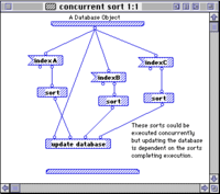 Several features of the Prograph system are evident in this picture of a database sorting operation. The upper bar shows that this method, concurrent sort, is being passed in a single parameter, A Database Object. This object is then fed, via the lines, into several operations. Three of these extract a named index (indexA etc.) from the object using the getter operation (the unconnected getter output passes on the "whole" object), and then passes the extracted index to a sort operation. The output of these sort operations are then passed, along with a reference to the original database, to the final operation, update database. The bar at the bottom of the picture represents the outputs of this method, and in this case there are no connections to it and so this method does not return a value. Also note that although this is a method of some class, there is no self; if self is needed, it can be provided as an input or looked up.