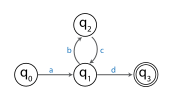 The FSA accepts the string: abcd. Since this string has a length which is at least as large as the number of states, which is four, the pigeonhole principle indicates that there must be at least one repeated state among the start state and the next four visited states. In this example, only q1 is a repeated state. Since the substring bc takes the machine through transitions that start at state q1 and end at state q1, that portion could be repeated and the FSA would still accept, giving the string abcbcd. Alternatively, the bc portion could be removed and the FSA would still accept giving the string ad. In terms of the pumping lemma, the string abcd is broken into an x portion a, a y portion bc and a z portion d.