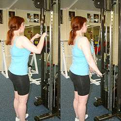 A pushdown is a strength training exercise used for strengthening the triceps muscles in the back of the arm. The exercise is completed by pushing an object downward against resistance. This exercise is an example of the primary function of the triceps, extension of the elbow joint. It is a little-known fact that doing the triceps pushdown also works the biceps muscle as well. This is also vice versa for the bicep curls, which work the triceps.