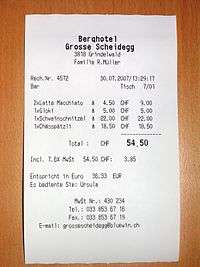 The custom in most shops at the point of sale is for a salesperson to scan or in some way record the price of a customer's proposed purchases, including tax, discounts and other adjustments. In traditional situations and still in some family businesses today, the salesperson would then show the customer the summary, the invoice, for their agreement; but most shops today bypass this stage. The practice of presenting an invoice is most common in restaurants where a "bill" is presented after a meal. The salesperson would indicate to the customer the total amount payable, and the customer would indicate the proposed method of payment of the amount. After processing the payment, the salesperson would then generate in the one document an invoice and receipt. If payment was made by a payment card, a payment record would also be generated. These are the printed record of the transaction, and are legal documents.[1] A copy of these documents would be handed to the customer. In many countries a retailer is under a legal obligation to provide a receipt to a customer which shows the details of a transaction and the shop and other information, so that the tax authority can check that sales are not being hidden.[2] The document may also include messages from the retailer, warranty or return details, special offers, advertisements or coupons, but these are merely promotional and not part of the formal receipt.