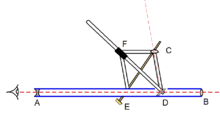 This is an interesting instrument, combining the functionality of a radio latino with a double telescope. The telescope (AB in the adjacent image), has an eyepiece at one end and a mirror (D) partway along its length with one objective lens at the far end (B). The mirror only obstructs half the field (either left or right) and permits the objective to be seen on the other. Reflected in the mirror is the image from the second objective lens (C). This permits the observer to see both images, one straight through and one reflected, simultaneously besides each other. It is essential that the focal lengths of the two objective lenses be the same and that the distances from the mirror to either lens be identical. If this condition is not met, the two images cannot be brought to a common focus.