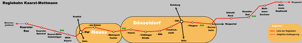 The line actually starts in Kaarst at the Kaarster See station ("Lake of Kaarst") and follows the remaining section of the Neuss-Viersen railway until Neuss Hauptbahnhof. The line runs along the Mönchengladbach–Düsseldorf railway to Düsseldorf Hauptbahnhof and then along the Düsseldorf–Elberfeld railway to Düsseldorf-Gerresheim. At Neuss, Düsseldorf Hauptbahnhof and Düsseldorf-Gerresheim there are connections to the lines S1, S6, S5/S8, S11 and S68 (in peak hours), which runs into the direction of Solingen, Dortmund, Essen, Cologne, Mönchengladbach, Hagen, Bergisch Gladbach and Düsseldorf International Airport. From Düsseldorf-Gerresheim to Mettmann the line runs along a remaining part of the largely closed Düsseldorf-Derendorf–Dortmund Süd railway through Neandertal and terminates in Mettmann-Stadtwald, which together with Mettmann-Jubiläumsplatz bus stop is an important traffic node. Services are operated with Bombardier Talent diesel multiple units.