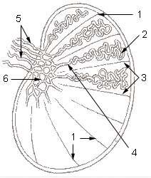 ![]() 1: Testicular septa 2: Convoluted seminiferous tubules 3: Testicular lobules 4: Straight seminiferous tubules 5: Efferent ductules 6: Rete testis | |
