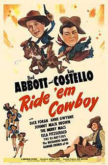 Ride 'Em Cowboy is a 1942 film starring the comedy team of Abbott and Costello. The supporting cast features Dick Foran, Anne Gwynne, Johnny Mack Brown, Ella Fitzgerald, Samuel S. Hinds, Douglas Dumbrille and Morris Ankrum, and the movie was directed by Arthur Lubin.