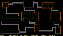 As Toy was more proficient at programming, he led the development of the game in the C language which generally produced fast effective code. Wichman learned the language from Toy as they went along while providing significant input on the design of game.[3][4] The first two major aspects of the game developed was the method of displaying the dungeon on screen to the player, and how to generate the dungeon in a random manner. Limited by choices of what a terminal could display, they stuck to ASCII-based characters, such as . for empty floor space, + for doors, and | and - for walls of the dungeon. They also opted to use the "at" symbol (@) to represent the player, considering this showed the player "where they're at".[3] For the dungeon, they found initial attempts at purely random generation to be weak, in some cases having a stairway ending up in a room inaccessible to players. They found a solution through procedural generation, where each level would start on the idea of a 3x3 tic tac toe grid, with each room of various size occupying one space in this grid, and then creating the hallways to connect the rooms.[3] Once they could have their character move about these randomly created dungeons, they then added equipment, magic items, and monsters. With magic items, they wanted the effects of these items to be a mystery on each run through, and thus would initially present the items to the player only by a descriptor such as by color, and only later in the game give the true name of the item once the player experimented or used another means to identify the item.[3] For monsters, they wanted to have more advanced intelligence routines as the player got to deeper depths of the dungeons, but had started running into memory limits on the VAX-11, and simply made the monsters stronger with more health to pose more of a challenge.[3][1]