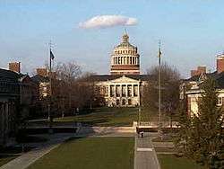 Rush Rhees Library is the main academic library of the University of Rochester in Rochester, New York. It is one of the most visible and recognizable landmarks on the university's River Campus. Construction began in 1927 with the other original River Campus buildings and the library was dedicated in 1930. It is named after Benjamin Rush Rhees, the university's third president. A major addition was added in 1970, which now houses the main computer lab, additional stacks and office space. Rush Rhees is the flagship of the River Campus Libraries System, which holds about 3 million volumes. The library features an elevator completely original from 1930.[1]