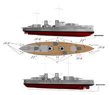 Several design proposals were submitted, all calling for heavy main guns, between 30.5 cm (12 in) and 34.3 cm (13.5 in) calibers.[2] However, financial limitations dictated that smaller, less expensive weaponry would be used instead. The final design therefore used the same 28 cm (11 in) double turret introduced for the last two Nassau-class battleships[5] — hydraulic elevated Drh LC/1907[4] instead of electrical elevated Drh LC/1906.[6][lower-alpha 3] In compensation, the design was given a relatively heavy secondary armament.[7]