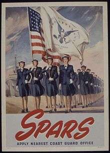 The U.S. Coast Guard (USCG) Women's Reserve act was passed by the 77th Congress as Public Law 773, and signed into law by the president on 23 November 1942. It amended the USCG Auxiliary and Reserve Act of 1941, providing for the releasing of officers and enlisted men for duty at sea to be replaced by women at shore stations. It was established as a branch of the USCG Reserve, with authority to enlist and appoint women to serve during World War II and for six months thereafter. The reservists were to be trained and qualified for duty at the continental shore stations of the USCG. They were not to be used to replace civil service personnel. The act was similar to that of the Navy's Women Accepted for Volunteer Emergency Service or WAVES.[1] Initially, the SPARS were only stationed in the United States, but in 1944 they were allowed to deploy to Hawaii and Alaska.[2] The USCG was the smallest of the military branches and was under the wing of the United States Department of the Navy, although, just prior to World War II, it had been under the supervision of the United States Department of the Treasury.[3]