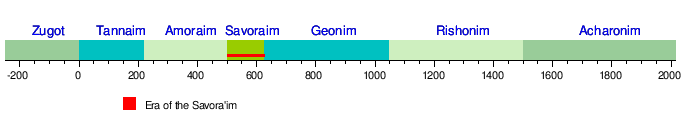 A Savora (Hebrew: [savoˈʁa]; Aramaic: סבורא, "a reasoner", plural Savora'im, Sabora'im [savoʁaˈʔim], סבוראים) is a term used in Jewish law and history to signify one among the leading rabbis living from the end of period of the Amoraim (around 500 CE) to the beginning of the Geonim (around 600 CE). As a group they are also referred to as the Rabbeinu Sevorai or Rabanan Saborai, and may have played a large role in giving the Talmud its current structure. Modern scholars also use the plural term Stammaim (Hebrew; "closed, vague or unattributed sources") for the authors of unattributed statements in the Gemara.