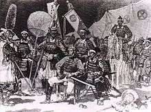 Saigō Takamori (seated, in Western uniform), surrounded by his officers, in samurai attire, during the 1877 Satsuma rebellion. News article in Le Monde Illustré, 1877.