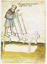 A pit saw was a two-man rip saw. In parts of early colonial North America, it was one of the principal tools used in shipyards and other industries where water-powered sawmills were not available. It was so-named because it was typically operated over a saw pit, either at ground level or on trestles across which logs that were to be cut into boards. The pit saw was "a strong steel cutting-plate, of great breadth, with large teeth, highly polished and thoroughly wrought, some eight or ten feet in length"[12] with either a handle on each end or a frame saw. A pit-saw was also sometimes known as a whipsaw.[13] It took 2-4 people to operate. A "pit-man" stood in the pit, a "top-man" stood outside the pit, and they worked together to make cuts, guide the saw, and raise it.[14] Pit-saw workers were among the most highly paid laborers in early colonial North America.