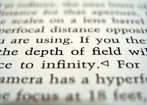 - ↑ When the lens plane is not parallel to the image plane, the blur spots are ellipses rather than circles, and the limits of DoF are not exactly planar. There is little data on human perception of elliptical rather than circular blurs, but taking the major axis of the ellipse as the governing dimension is arguably the worst-case condition. Using this assumption, Robert Wheeler examines the effect of elliptical blur spots on DoF limits for a tilted lens in his Notes on View Camera Geometry; he concludes that in typical applications, the effect is negligible, and that the assumption of planar DoF limits is reasonable. His analysis considers only points on a vertical plane through the center of the lens, however. Leonard Evens examines the effect of elliptical blur at any arbitrary point in the image plane, and concludes that, in most cases, the error from assuming planar DoF limits is minor.
