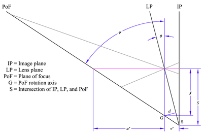 - ↑ Strictly, as the focus distance approaches infinity, v′ cos θ → f; hence, the approximate formulas differ by a factor of cos θ. At small values of θ, cos θ ≈ 1, so the difference is negligible. With large values of tilt, as occasionally might be needed with a large-format camera, the error becomes greater, and either the exact formula or the approximate formula in terms of tan θ should be used.